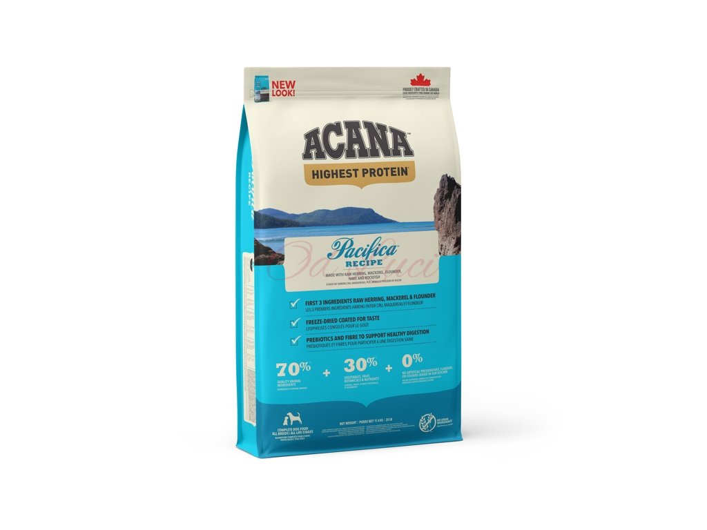 ACANA PACIFICA OBSAHUJE VOLNĚ LOVENÉ SLEDĚ, SARDINKY, PLATÝSE, HEJKY A OKOUNÍKY, DODÁVANÉ ČERSTVÉ NEBO SYROVÉ ZE SEVERNÍHO POBŘEŽÍ OSTROVA VANCOUVER, A NAPODOBUJE TAK PŘIROZENOU STRAVU PSŮ. S NÍZKÝM OBSAHEM SACHARIDŮ A VYSOKÝM OBSAHEM PROTEINŮ Z RYB PRO DOSAŽENÍ VRCHOLOVÉ KONDICE.