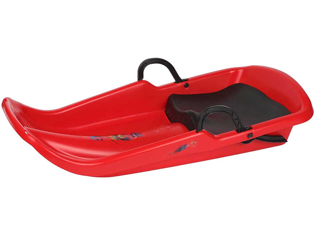 Bob plastový CYCLONE v červené barvě, pro děti, na sníh. Boby se dvěma brzdami a sedátkem. Určeno pro rekreační sport. Vestavěné sedátko odděluje dítě od studeného sněhu a tím zajišťuje lepší