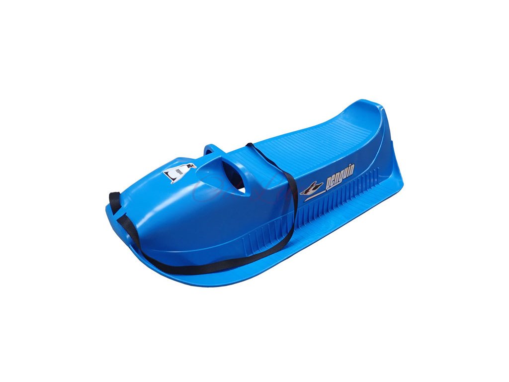 Sáně ACRA Alfa Penguin z plastu na sníh. Plastové sáňky do sněhu, v modré barvě, pro rekreační využití. Vhodné pro menší děti. Saně mají v přední části dutiny na držení při jízdě.