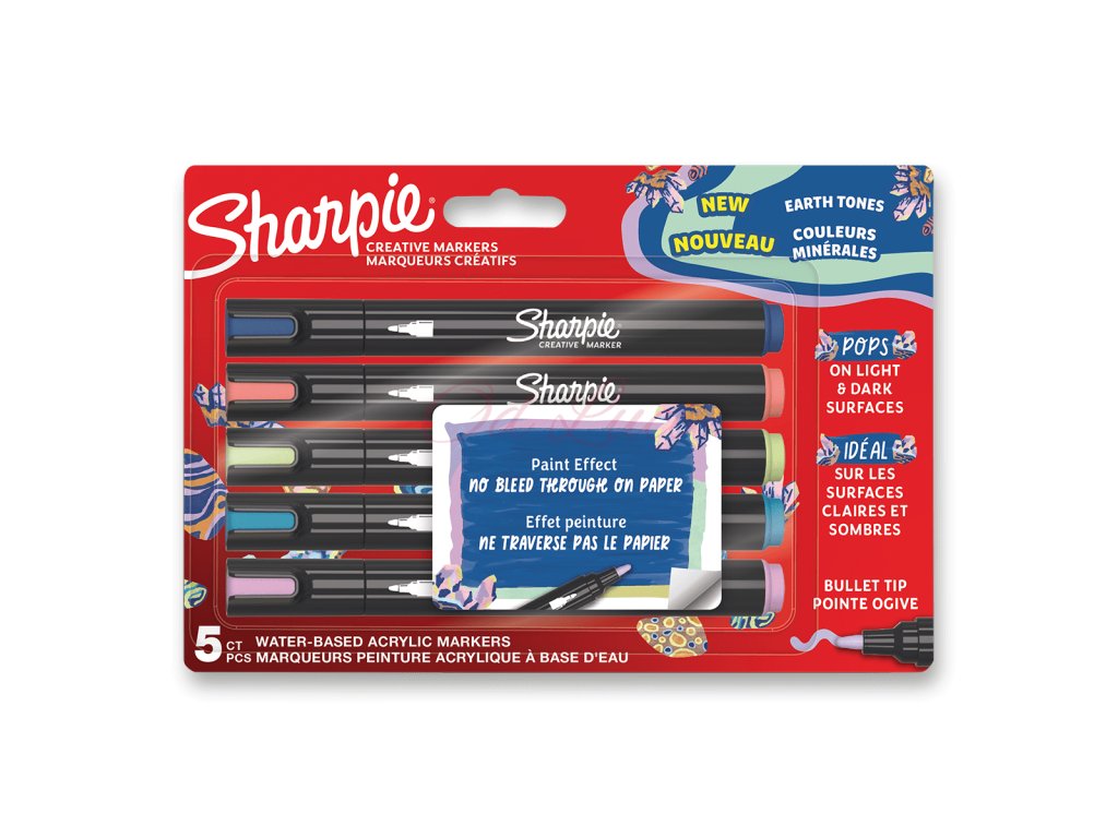 Kreativní akrylový popisovač Sharpie Acrylic Marker Bullet s kulatým hrotem. Vhodný k použití na téměř všechny povrchy: papír, kov, dřevo, keramika, sklo, kámen, textil. Sada 5 barev.
