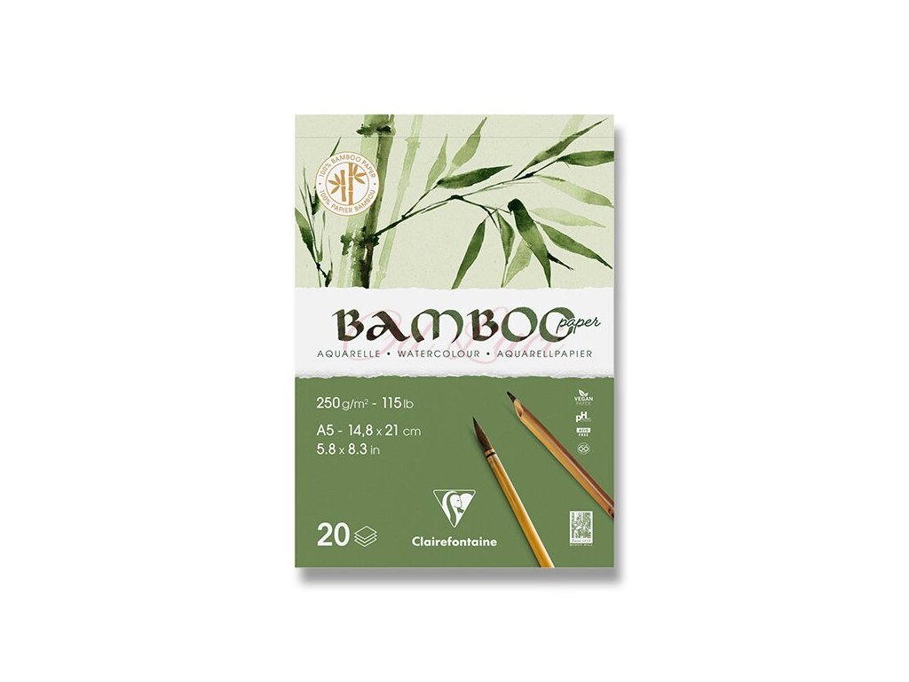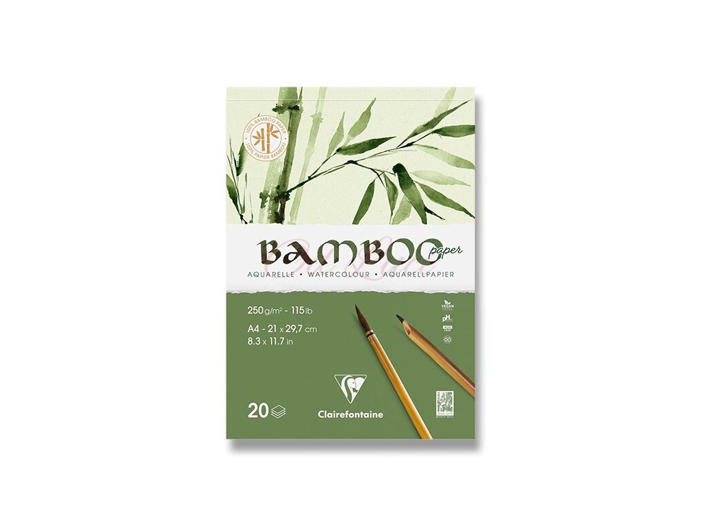 Akvarelový blok Clairefontaine Bamboo Aquarelle 250 g je 100% veganský. Blok má vysoce kvalitní přírodní bílý papír pro suché i mokré techniky s jemným zrnem. Ideální je pro akryl nebo akvarel a kombinované práce s tužkou nebo uhlem. Obsahuje 20 listů a má gramáž 250 g/m2.