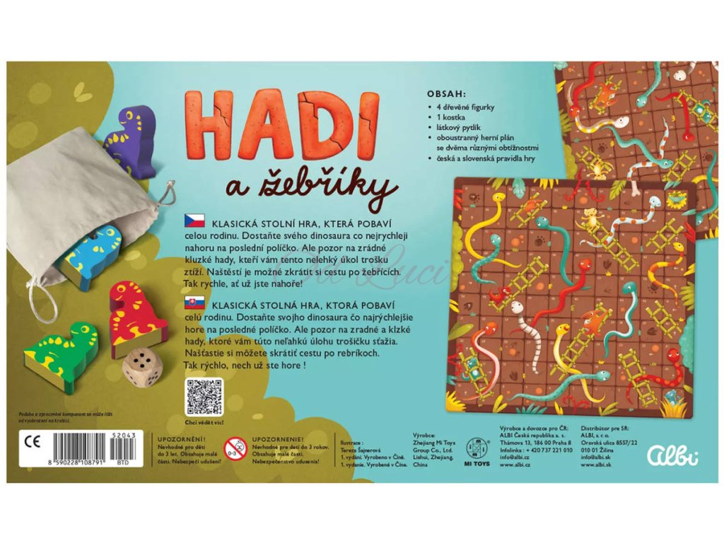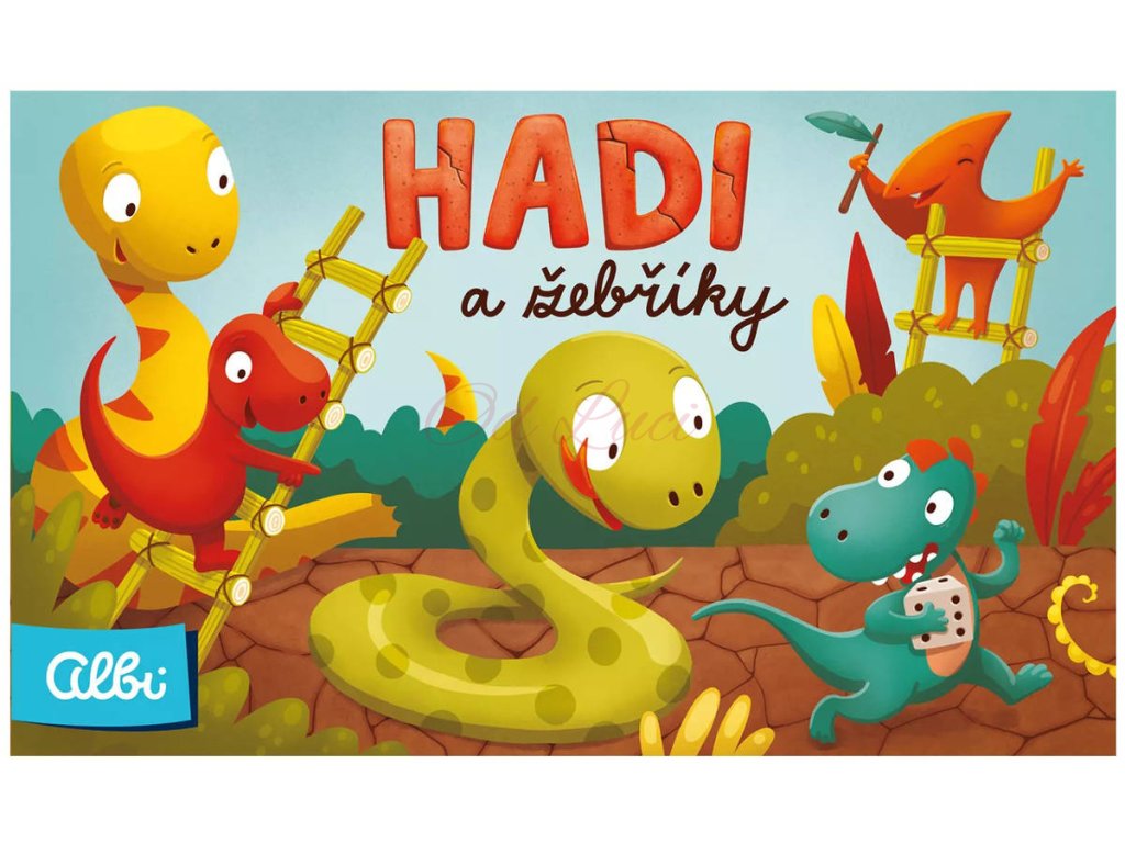 Klasická stolní hra, která zabaví děti i rodiče. Dostaňte svého dinosaura co nejrychleji nahoru na poslední políčko. Ale pozor na zrádné a kluzké hady, kteří vám tento nelehký úkol trošku ztíží. Naštěstí je možné zkrátit si cestu po žebřících. Roztomilé ilustrace, dřevěné figurky dinosaurů, oboustranný herní plán a jednoduchá pravidla zaručí zábavu pro malé děti od 4 let.
