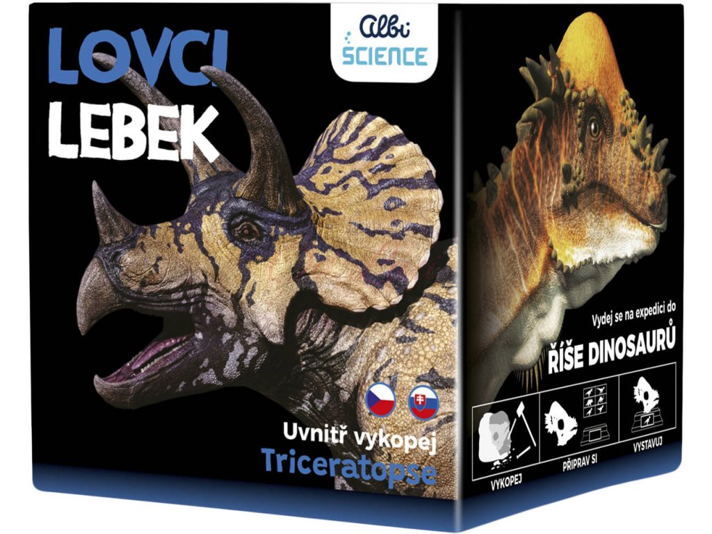 ALBI Science - Lovci lebek: Triceratops. Vydejte se na expedici do říše dinosaurů. Vykopejte lebku, očistěte ji a vystavte na stylovém podstavci jako originální dekoraci.