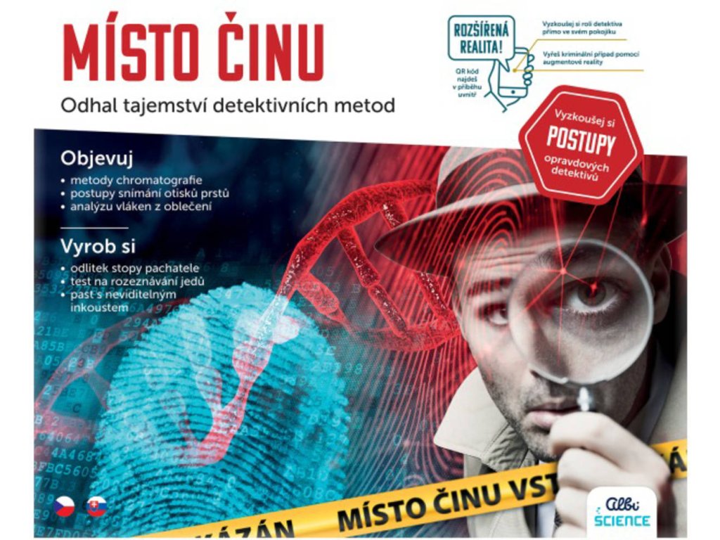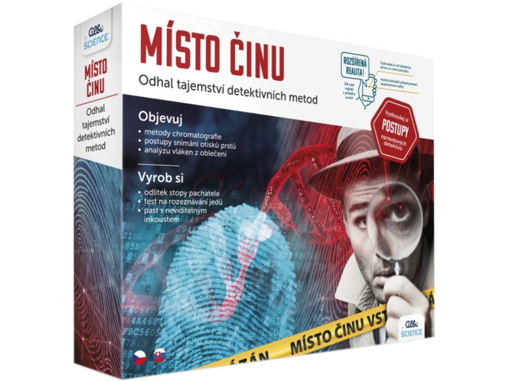 Objevitelská sada Místo činu z edice Albi Science potěší všechny malé detektivy od 8 let, kterým poskytne nezapomenutelné zážitky a vzdělání zároveň. Sada se zaměřuje na kriminalistické postupy i vědecké principy, na nichž jsou pokusy založeny, a představuje je formou kreativního zkoumání. Díky experimentům vědecké sady Místo činu si děti vyzkouší techniky detektivů – chromatografii, snímání otisků prstů, analýzu vláken z oděvů a mnohé další. Otestujtí podezřelé vzorky, naučí se zajímavosti o neviditelném inkoustu, který je vidět pouze pod ultrafialovým světlem, nebo třeba zjistí, jak určit pH tekutin a rozeznat tak potenciální „jed“ pomocí lakmusových papírků. Zkuste s dětmi rozšířenou realitu (AR) a ocitněte se přímo na místě činu! K vyřešení případu budete potřebovat pouze povídku Místo činu, která je součásti sady, a telefon či tablet s fotoaparátem/čtečkou QR kódů. Sada obsahuje spoustu komponentů a návod se zábavnými aktivitami, které je možné opakovat.
