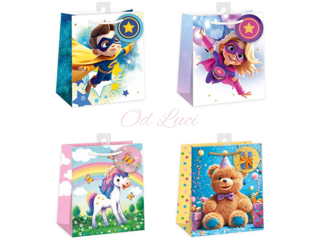 Argus papírová dárková taška mix s háčkem a originálními designy pro děti. Velikost 19 x 23 x 11,5cm. 4 motivy. Jednorožec, medvídek, akční hrdina chlapec / dívka.