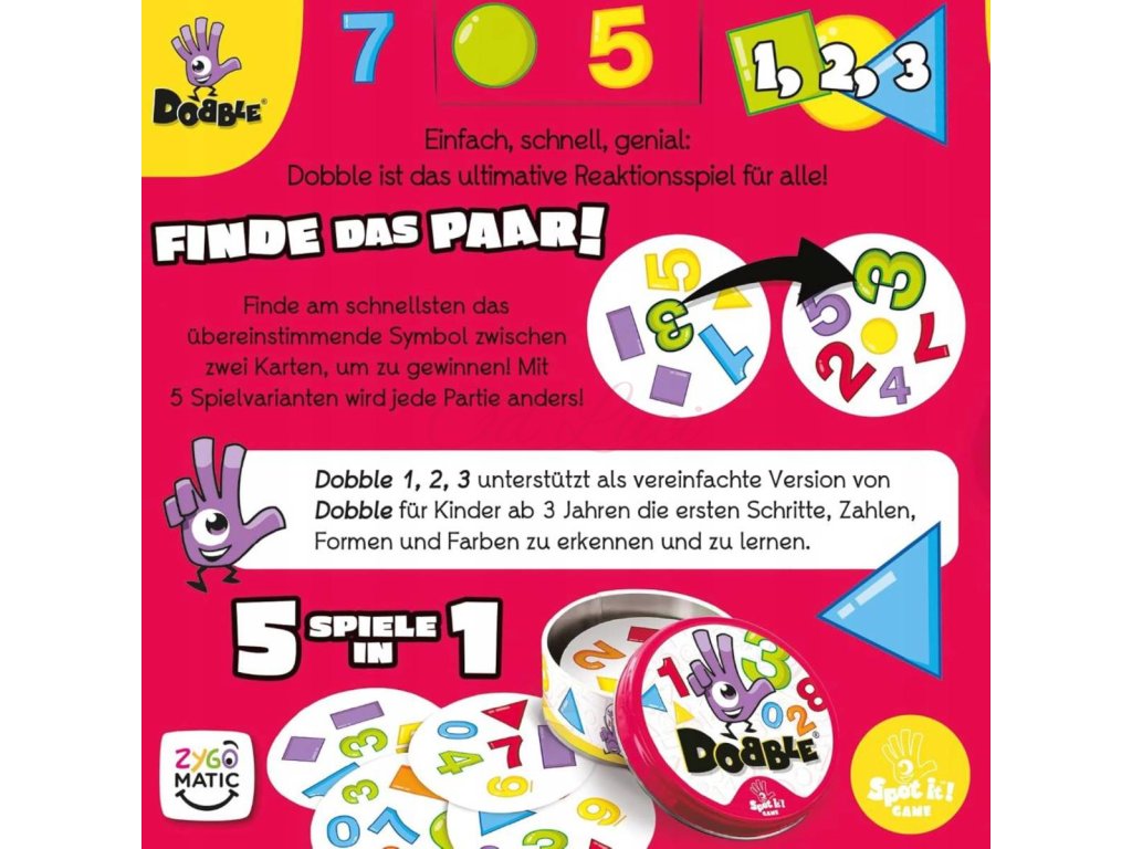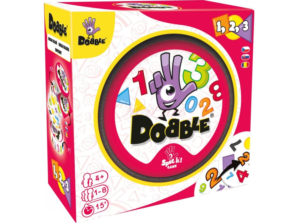 Dobble 1-2-3 je varianta oblíbené hry Dobble určená především pro menší děti, která při hraní přináší dětem pozvolný úvod do poznávání tvarů, čísel a barev.