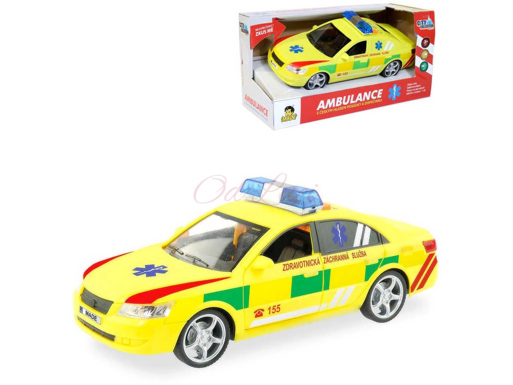 Vůz rychlé zdravotnické záchranné služby v reálném zbarvení a designu ambulance, známé z českých silnic, z edice City Collection. Ambulance jezdí na setrvačník a je vybavena funkčním majákem s modrými