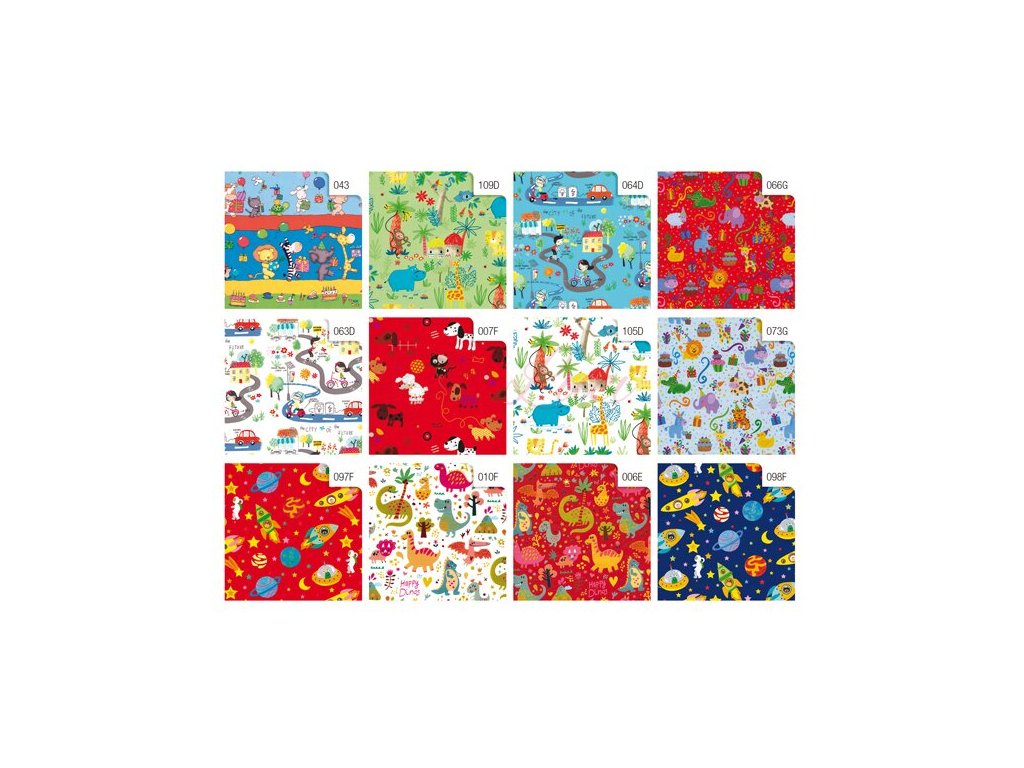 Dárkový balicí papír v dětských motivech a veselých barvách. Baleno v rolích, šířka role 70 cm, délka role 2 m.
