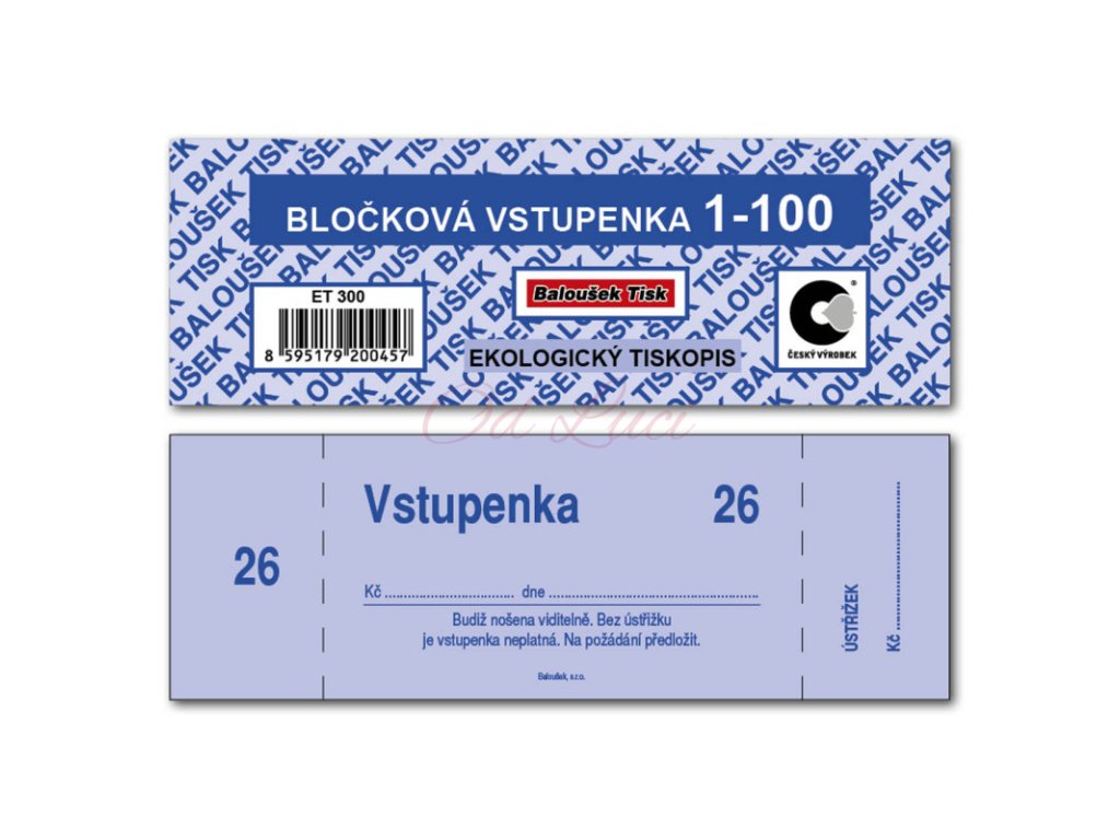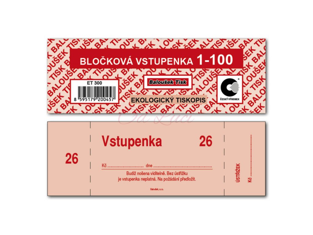 Bločkové vstupenky Baloušek 133 x 39 mm / 1-100 / 4 odstíny barev / ET300, nepropisující