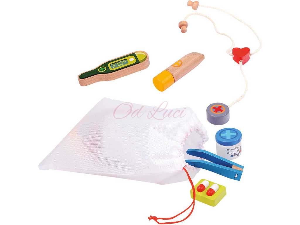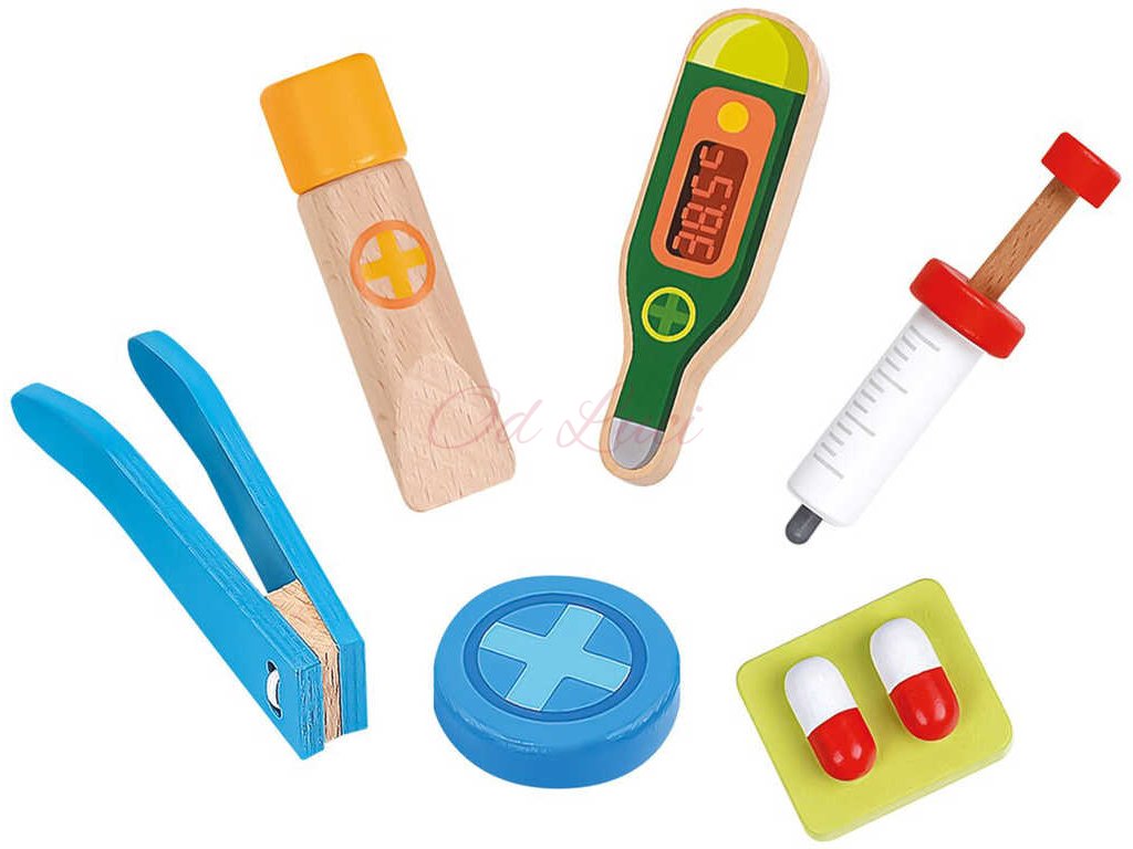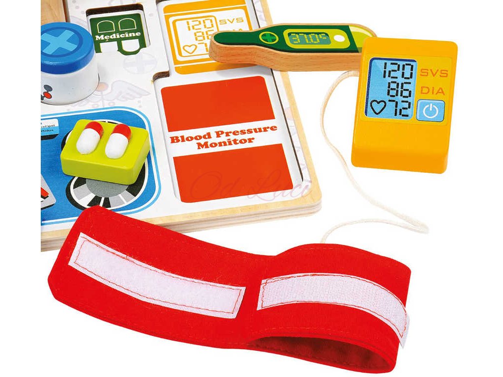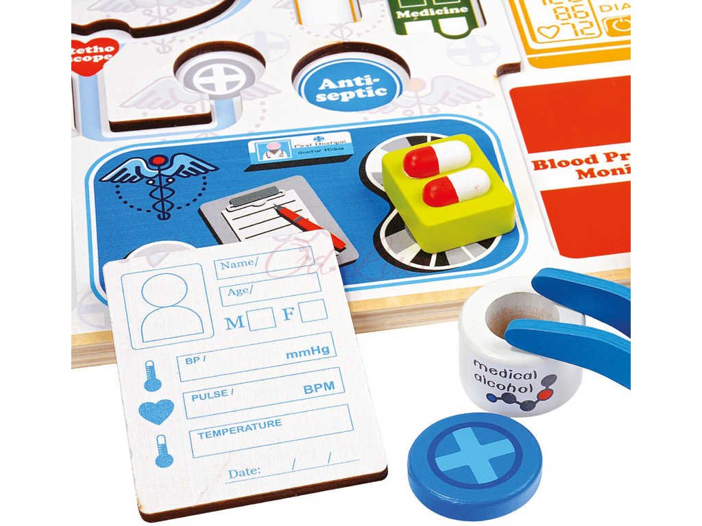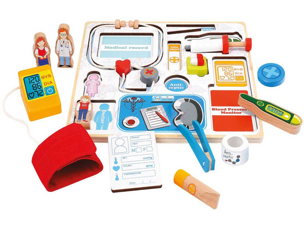 Balení osahuje 14 dílků s pevnou deskou vyrobenou z překližky. Děti se učí rozpoznávat a přiřazovat běžné náčiní z lékařské praxe. Procvičují zde jemnou motoriku, logické