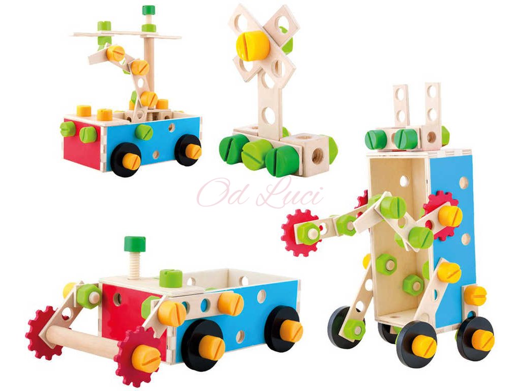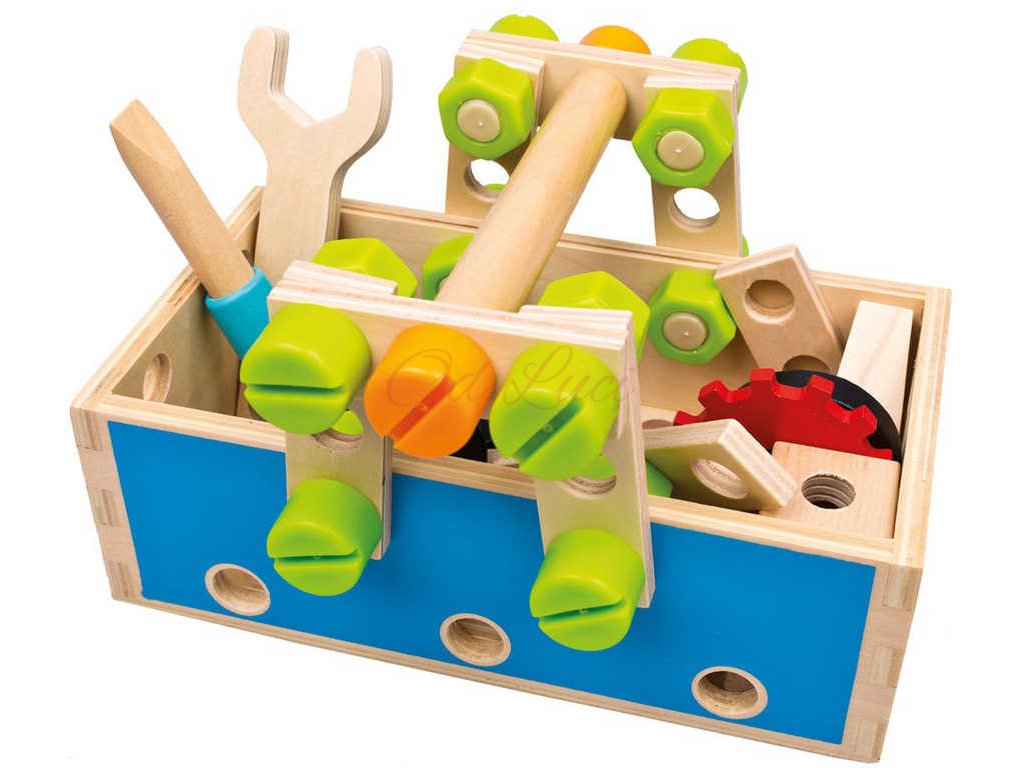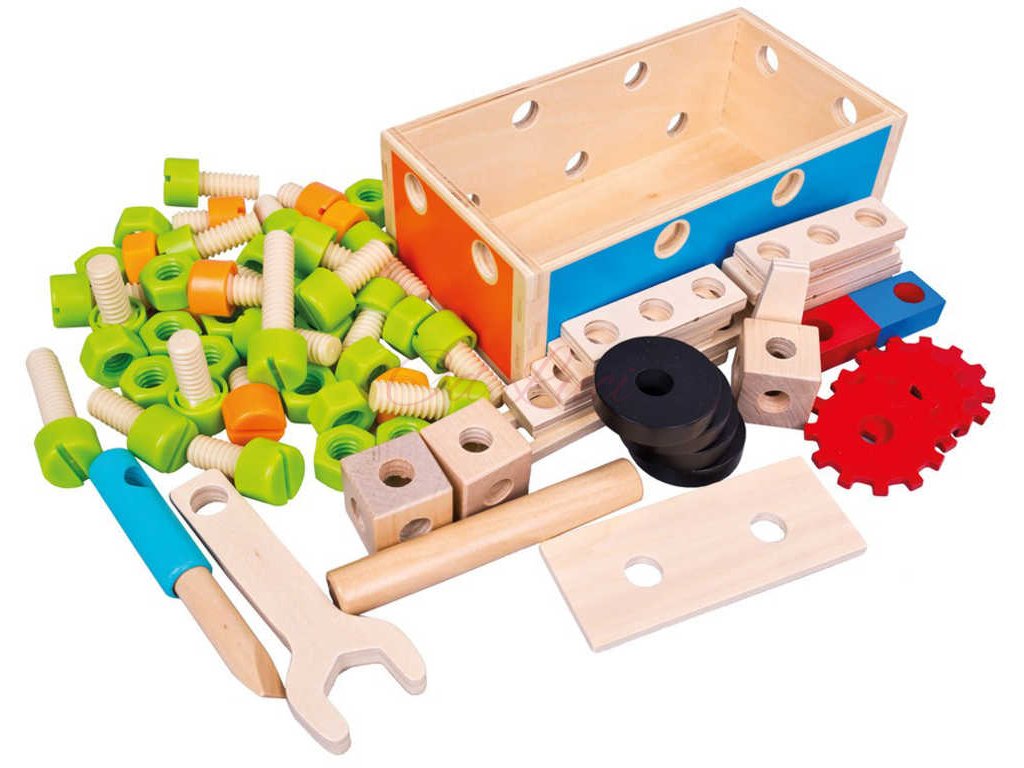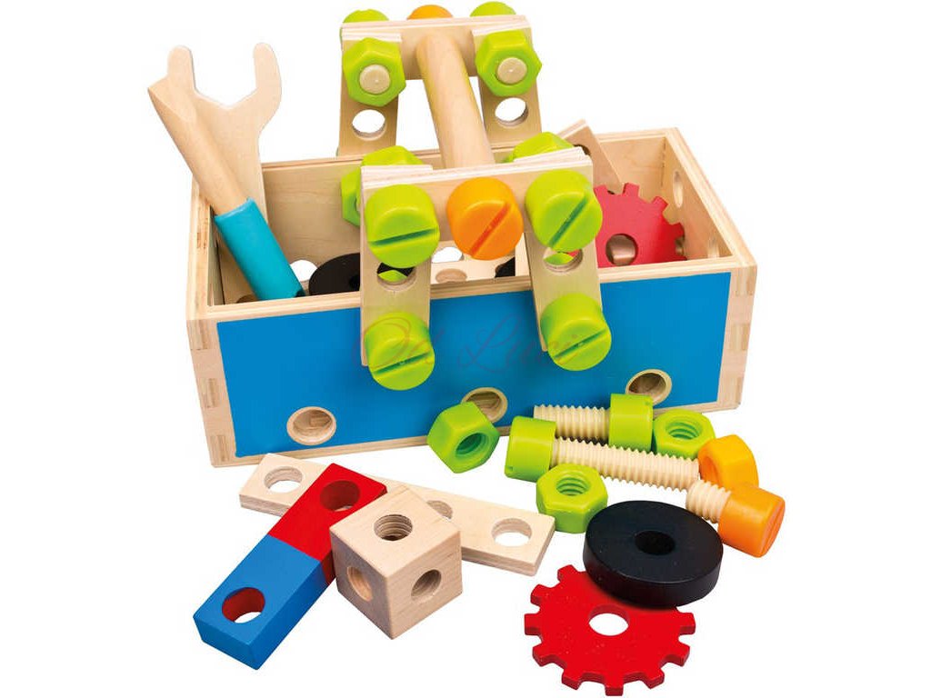 Dřevěnou přepravku s nářadím musí mít každý malý kutil. Z přepravky lze vyrobit nepřeberné množství skládaček dle fantazie malého kutila, např. autíčko, robot, zvířátko a mnoho dalších. Tvořivosti