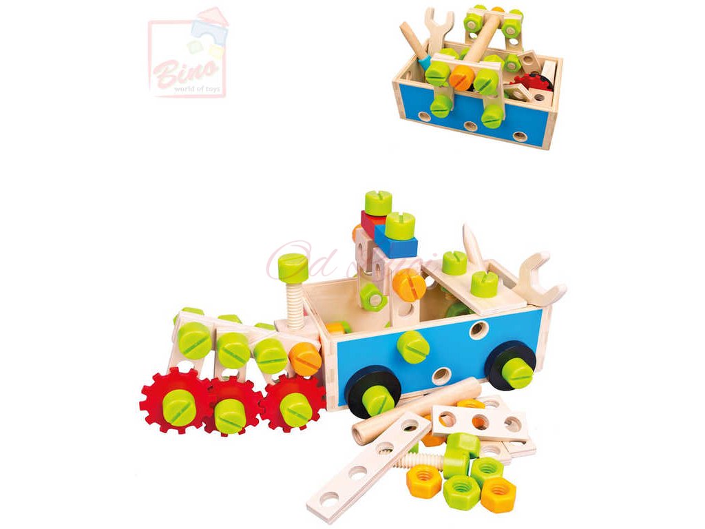 BINO DŘEVO Set dětské nářadí v přepravce šroubovací stavebnice
