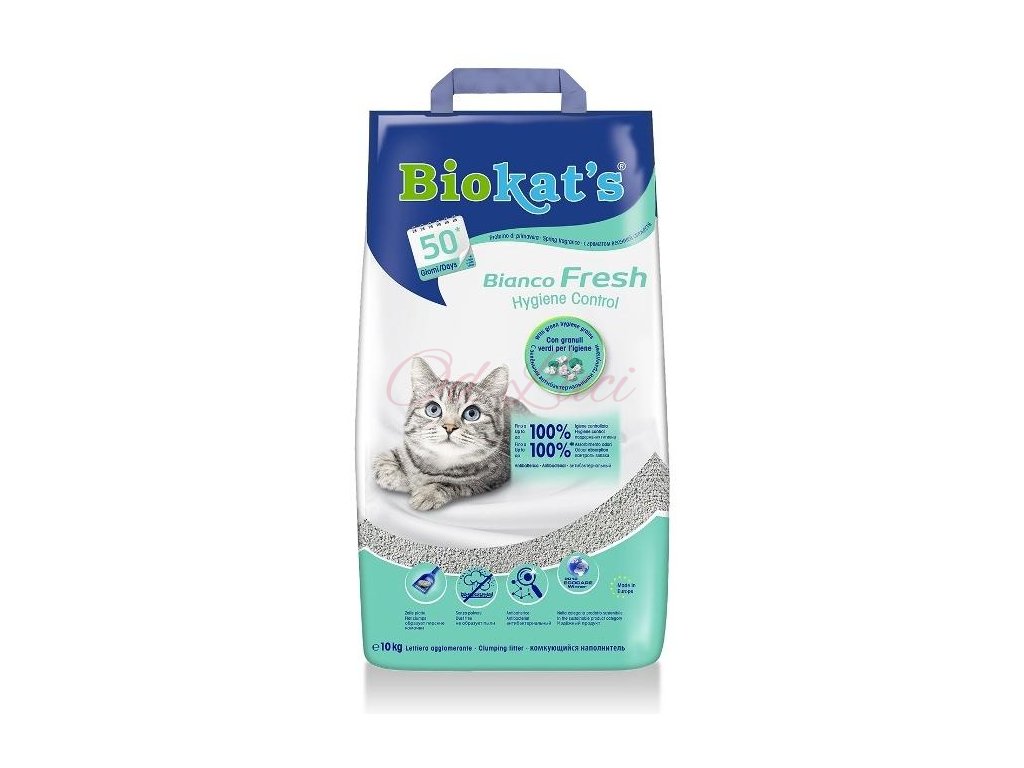 Podestýlka Biokat's Bianco Fresh Hygiene Control byla vyvinuta tak, aby splňovala rostoucí nároky kladené na kočičí podestýlky. Kočičí toaleta zůstává dlouho čistá a zároveň je bráněno vzniku nepříjemných pachů.