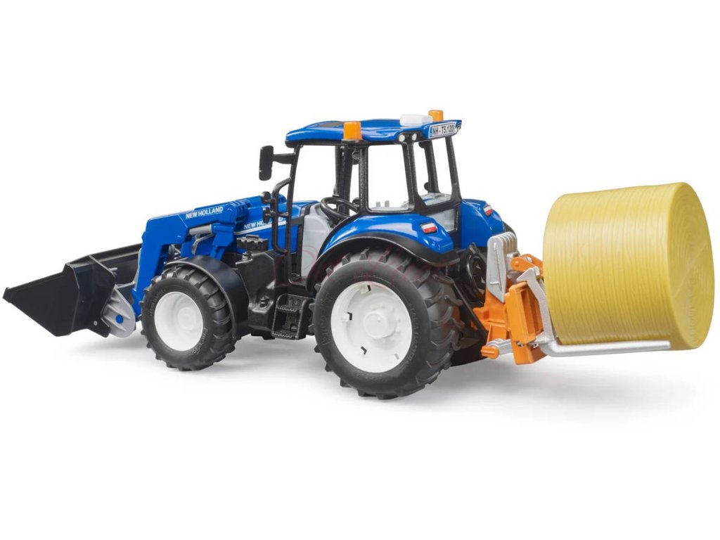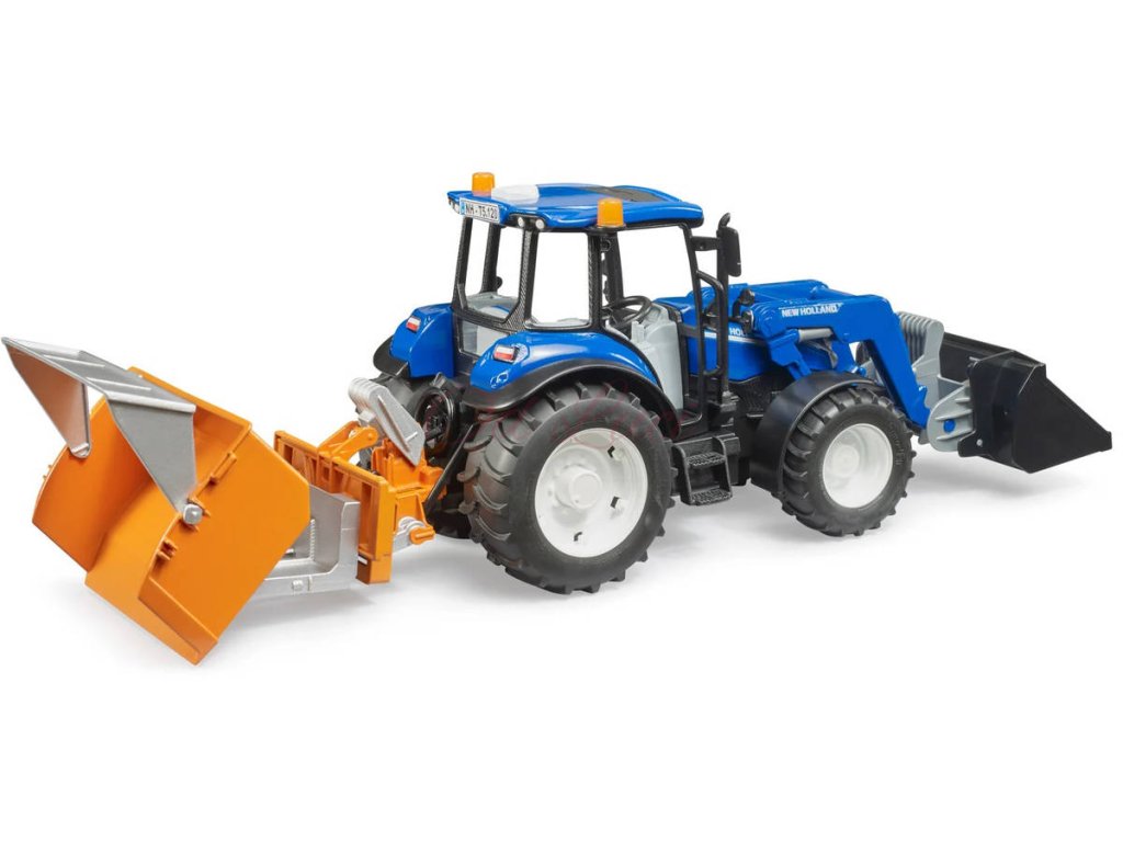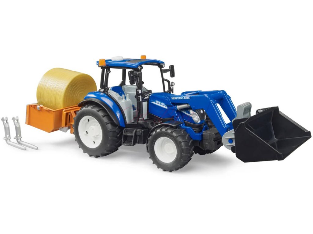 BRUDER 02187 Traktor New Holland T5 + plošina, balík, čelní nakladač