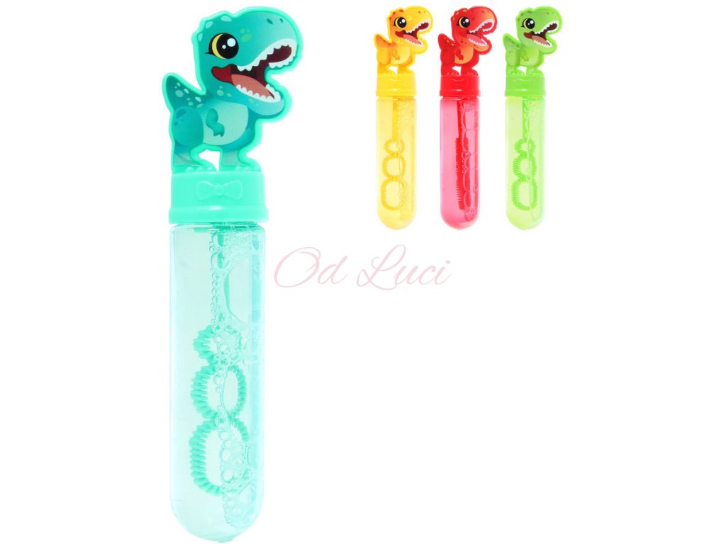Veselý dětský bublifukovač dinosaurus, s držátkem ve tvaru zvířátka, ve čtyřech barevných variantách. Velikost 14cm. Objem 30ml.