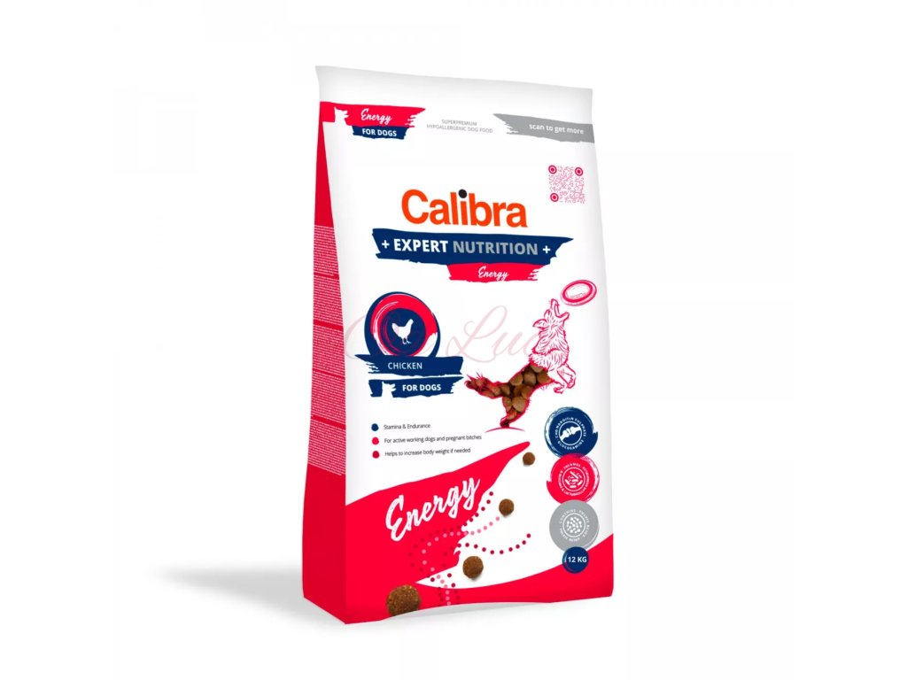 Calibra Dog Expert Nutrition Energy jsou hypoalergenní granule s vysokou energetickou hodnotou pro dospělé psy. Kompletní krmivo pomáhá podporovat výdrž a vytrvalost a je vhodné zejména pro psy pracovní či jinak aktivní (sport, výstavy atp.), je také vhodné pro psy, kteří potřebují zvýšit svou tělesnou hmotnost, a pro březí feny.