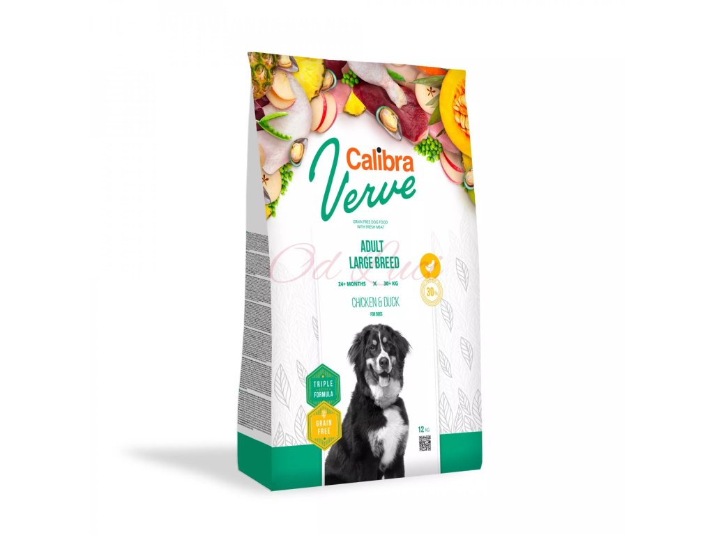 Calibra Dog Verve Adult Large Breed (Chicken & Duck) je kompletní suché krmivo s čerstvým masem a bez obilovin. Receptura je určena pro dospělé psy velkých plemen s hmotností nad 30 kg. 30 % čerstvého kuřecího masa a kvalitní kachní protein zaručují psovi optimální dávku zdravé výživy. Krmivo odpovídá nejvyšším požadavkům na přirozené stravování psa v souladu s jeho fyziologickými potřebami.
