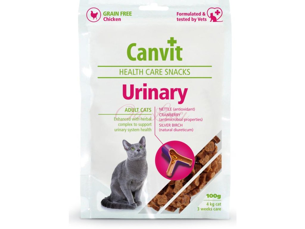 Záněty močového měchýře u koček patří mezi velmi časté problémy. Zánět močového měchýře je velmi bolestivé onemocnění, které se projevuje častým čůráním a močením mimo záchod. Brusinky, kopřiva a bříza převislá jsou přírodním zdrojem vitamínů, antioxidantů a látek, které preventivně působí proti zánětu močového měchýře. Mají silné antibakteriální účinky, blokují uchycení bakterií, vytvářejí ochrannou vrstvu sliznice močového měchýře, zvyšují produkci moči a potlačují nepříjemnou bolest. Pamlsek Canvit Urinary Health Care Snack je prevencí před záněty dolních cest močových u koček, a navíc vaší kočce skvěle chutná.