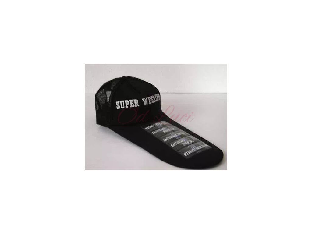 Vtipná černá kšiltovka s potiskem Super víkend může pobavit kohokoli.
