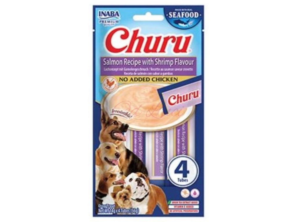 Tato receptura s lososem a s příchutí krevet obsahuje 4 lahodné krémové pamlsky vyrobené z volně žijících lososů a to bez obilovin, konzervantů a umělých barviv. Churu můžete podávat přímo z ruky, samostatně z misky nebo jsou ideální do lízací podložky. Pamlsky Churu mají vysoký obsah vody a díky tomu jsou vhodným doplňkem k suchému krmivu, pro rychlé doplnění tekutin a pro psy, kteří málo pijí. Pamlsky Churu jsou 100% přírodní a zdravé mlsání pro psy všech věkových kategorií. Churu jsou také ideální pro ukrytí tablety na odčervení či jiného léku, který je potřeba psovi nenásilně podat.