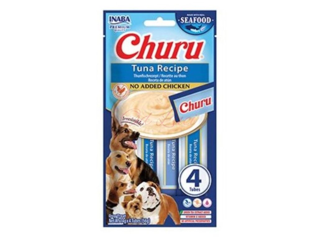 Tato receptura s tuňákem obsahuje 4 lahodné krémové pamlsky vyrobené z volně žijících tuňáků a to bez obilovin, konzervantů a umělých barviv. Churu můžete podávat přímo z ruky, samostatně z misky nebo jsou ideální do lízací podložky. Pamlsky Churu mají vysoký obsah vody a díky tomu jsou vhodným doplňkem k suchému krmivu, pro rychlé doplnění tekutin a pro psy, kteří málo pijí. Pamlsky Churu jsou 100% přírodní a zdravé mlsání pro psy všech věkových kategorií. Churu jsou také ideální pro ukrytí tablety na odčervení či jiného léku, který je potřeba psovi nenásilně podat.