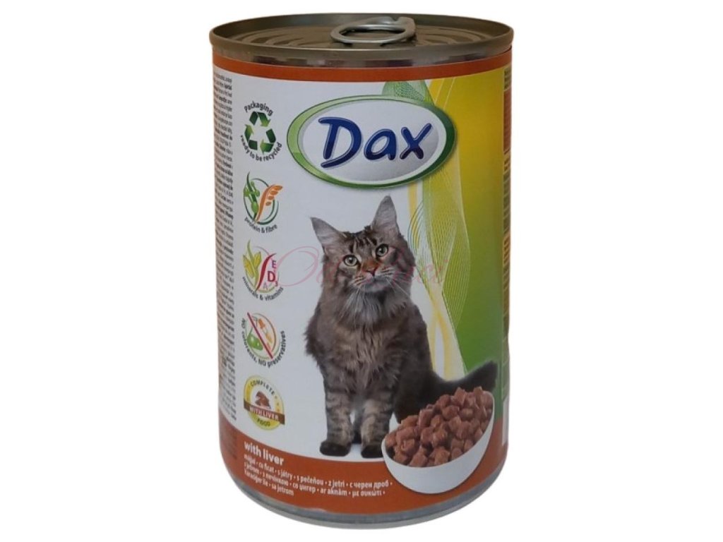 Dax konzerva s kousky jater v chutné omáčce je kompletní krmivo pro dospělé kočky.