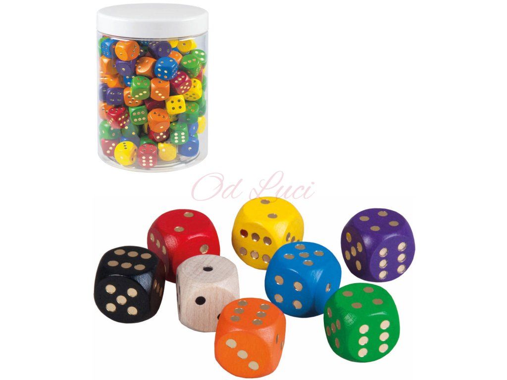 Dřevěné barevné hrací kostky. Velká sada 150ks v dóze. Doplněk k deskovým hrám nebo pro hru "Kostky".