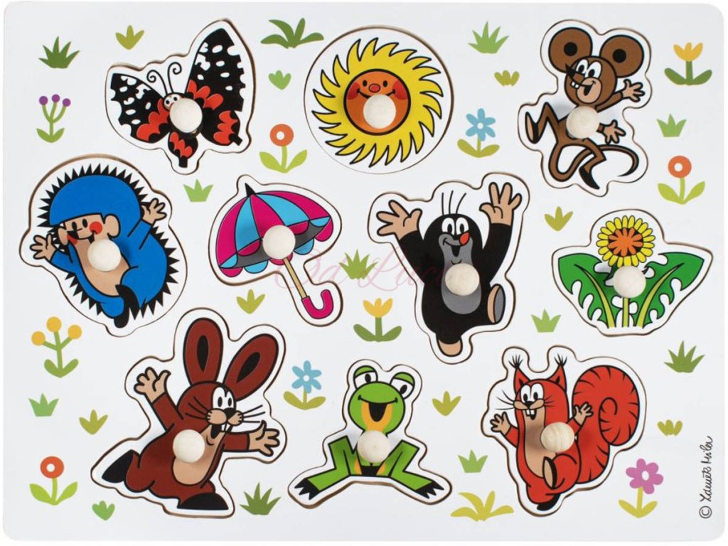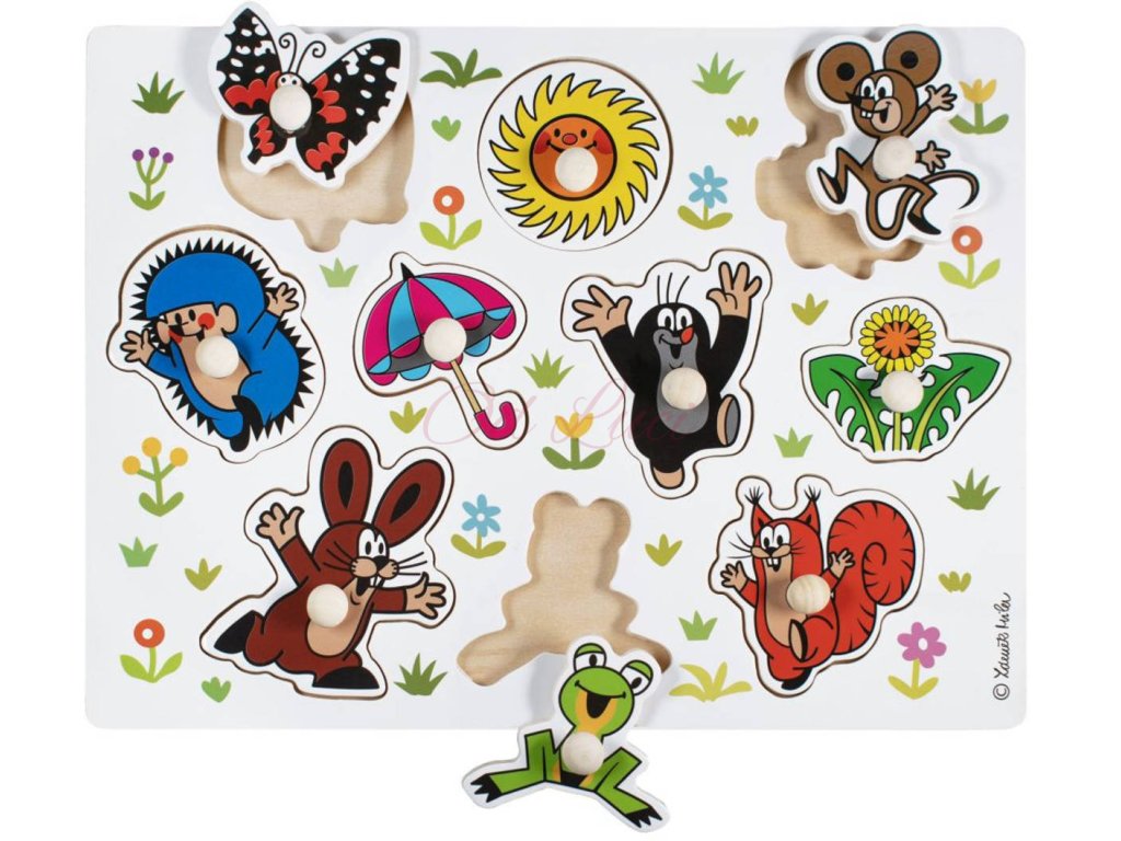 Didaktické vkládací puzzle Krtečka a jeho přátel. Hra učí děti poznávat tvary a pomáhá rozvíjet motoriku rukou. Výrobek splňuje požadavky EU na bezpečnost hraček a je vhodný pro děti od 18 měsíců. Dřevěná vkládačka pro malé děti s úchytkami. Dítě se podle obrysů a tvarů snaží najít správný obrázek (rozvoj představivosti a logického myšlení), a umístit jej do správného otvoru (rozvoj jemné motoriky).