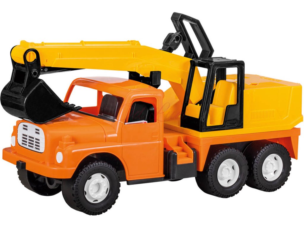 Tatra T148 žluto-oranžový bagr, kvalitní a odolné plastové auto, pracovní stroj pro děti na písek. Funkční prvky. Velikost 72cm. Vyrobeno v Česku.