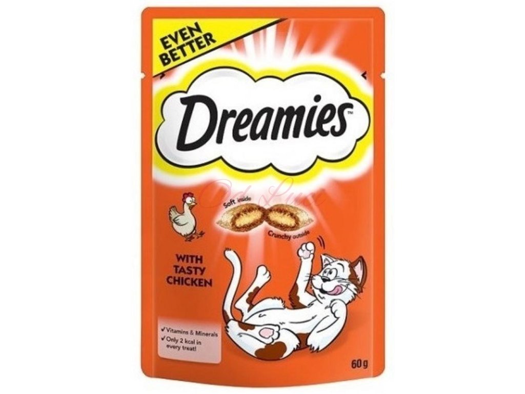 Dreamies křupavé polštářky plněné jemným krémem s kuřecí příchutí. Kočky šílí po neodolatelné chuti kočičích pamlsků DREAMIES. Lahodné a křupavé zvenku, měkké uvnitř – kočky jednoduše nedokáží odolat skvělé chuti DREAMIES. Tak jen do toho, zatřeste sáčkem a sledujte, jak se k vám vaše kočka rozběhne.