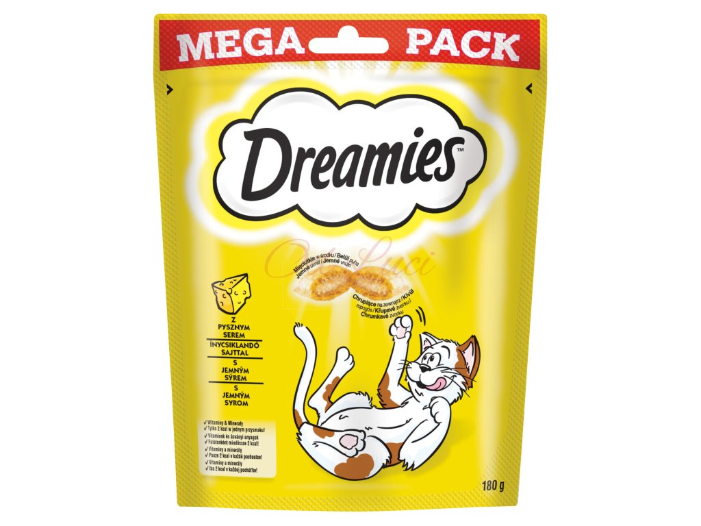 Dreamies křupavé polštářky plněné jemným krémem se sýrem. Kočky šílí po neodolatelné chuti kočičích pamlsků DREAMIES. Lahodné a křupavé zvenku, měkké uvnitř – kočky jednoduše nedokáží odolat skvělé chuti DREAMIES. Tak jen do toho, zatřeste sáčkem a sledujte, jak se k vám vaše kočka rozběhne.