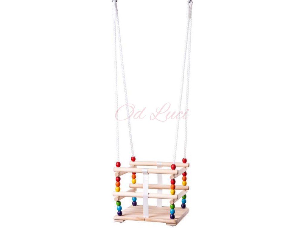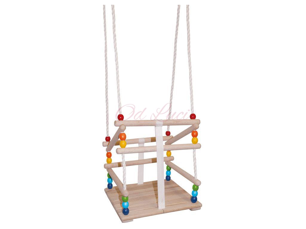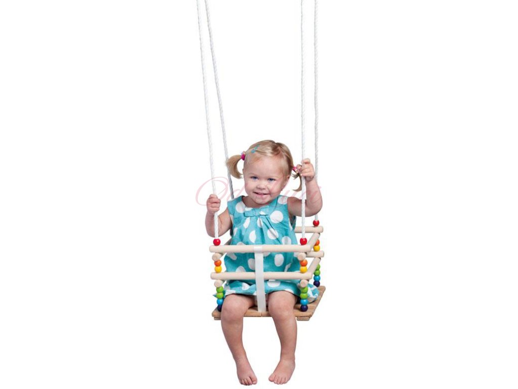 Tato houpačka pro nejmenší děti je vyrobena z masivního dřeva. Je opatřena bezpečnostní ohrádkou a popruhem umístěným mezi nohami dítěte, který zabraňuje vyklouznutí dítěte z houpačky. Houpačka má