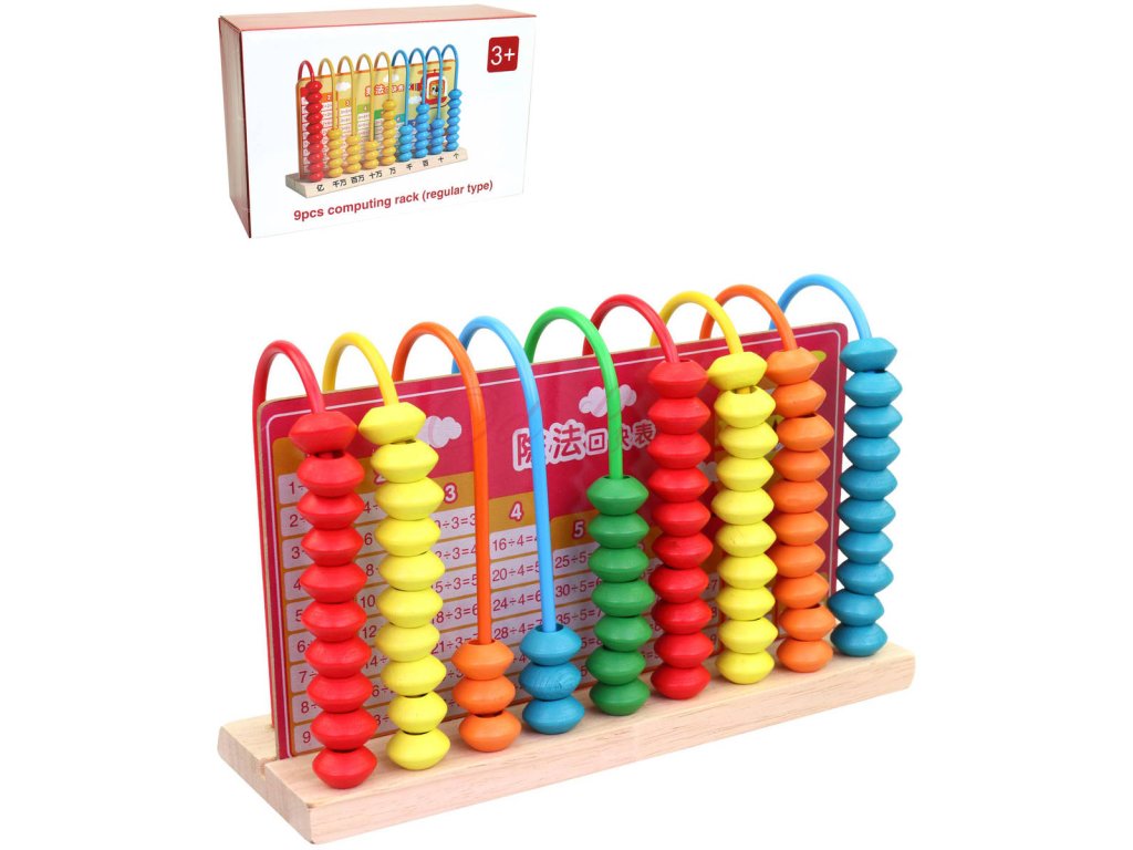 Pestře barevné dřevěné počítadlo je pomocník pro začínající matematické experty. Počítadlo má devět sloupků s deseti dřevěnýma korálkama a tabulku s několika vzorových příkladů.
