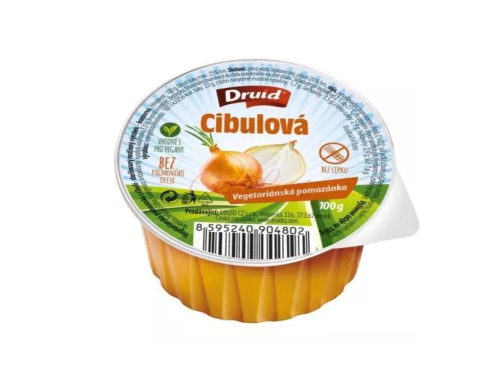 Druid vegetariánská pomazánka s cibulí 100g je oblíbená, krémová, bezlepková a veganská pomazánka s výraznou chutí karamelizované cibule (20 %), vyrobená ze sóji, řepkového oleje a přírodních surovin, ideální na pečivo, chlebíčky nebo na cesty, jelikož neobsahuje palmový olej a je lehce stravitelná.