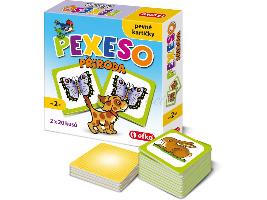 hráči hledají stejné dvojice kartiček. Vítězí ten, kdo najde nejvíce dvojic. Pexeso cvičí soustředění a dobrou paměť.