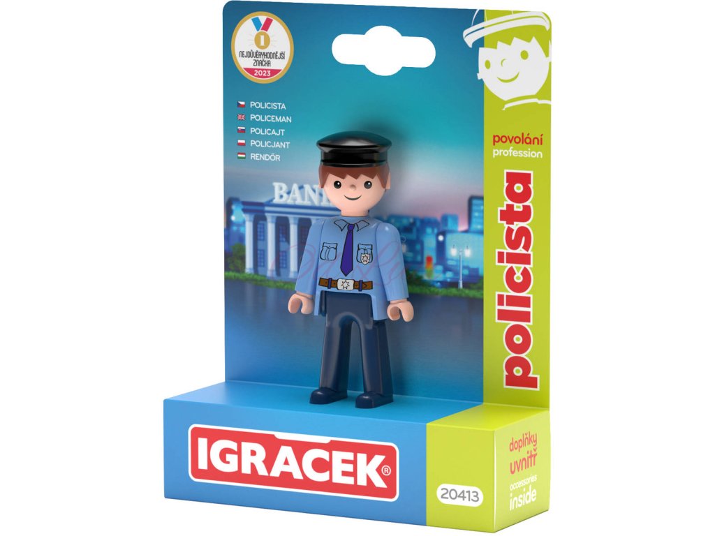 Pomáhej a hraj si! Dohlédni na pořádek v Igráčkově městě s policistou vybaveným obuškem a pistolí. Hračka rozvíjí jemnou motoriku a fantazii dětí. Legendární postavička od roku 1976. Vyrobeno v ČR.