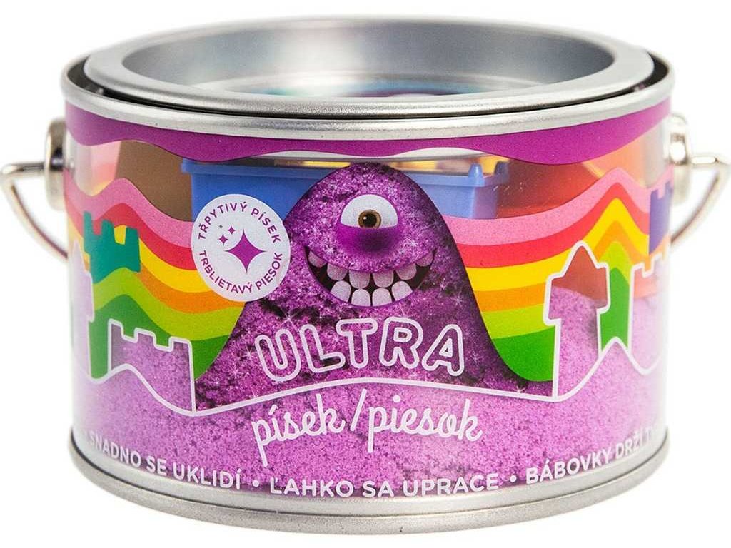 Kinetický ULTRA PÍSEK - fialový se třpytkami, v balení 200g s 5 formičkami. Skvělě se tvaruje, nešpiní, snadno se uklidí. Bábovky drží tvar. Můžete stavět i pod vodou. Díky své velmi hebké konzistenci se dá použít i