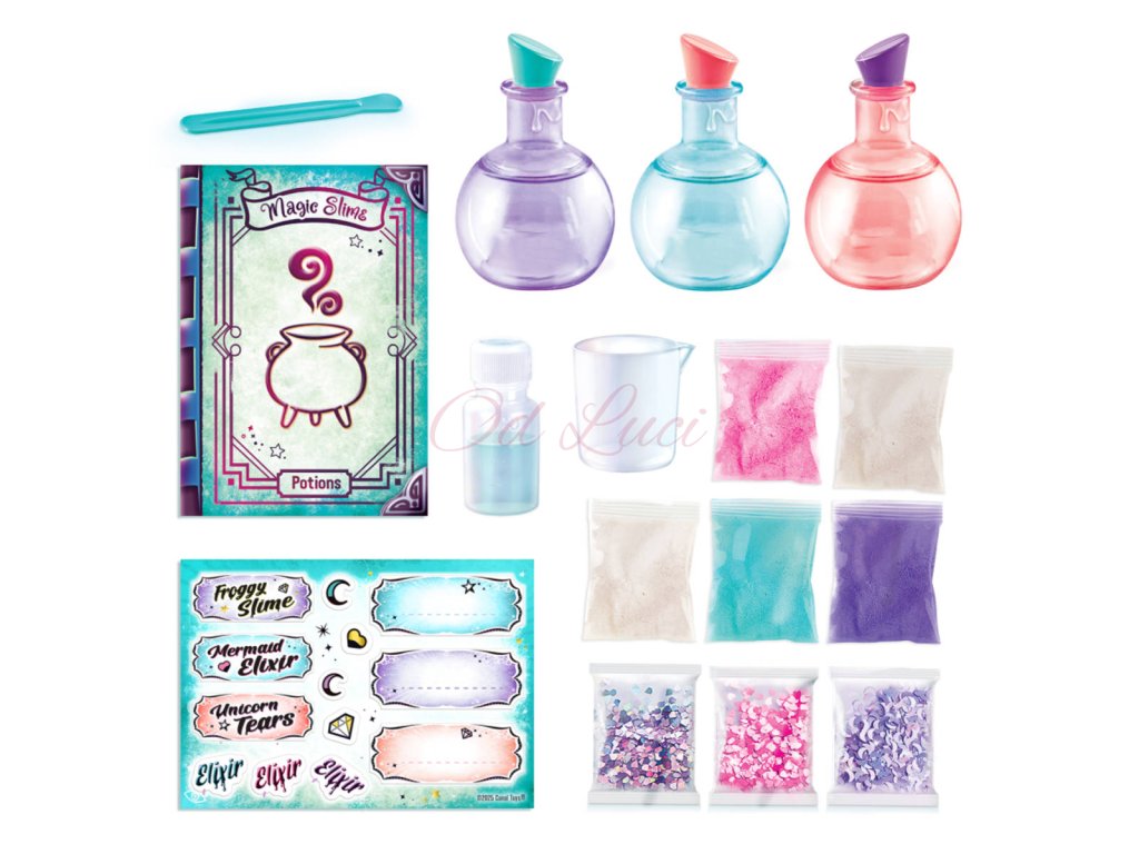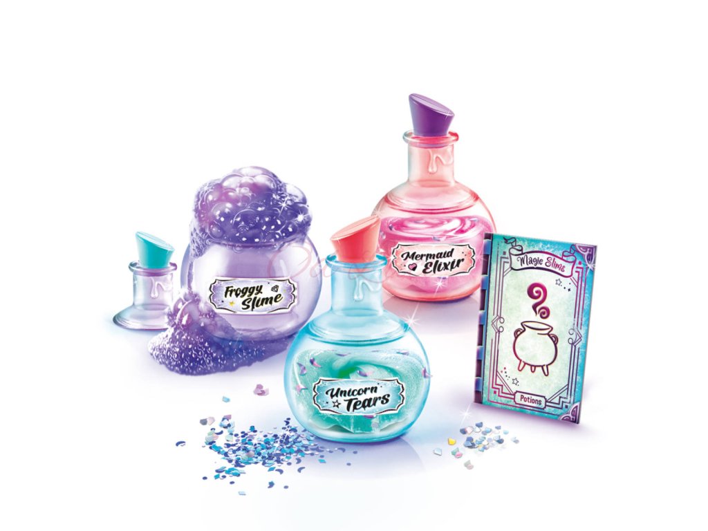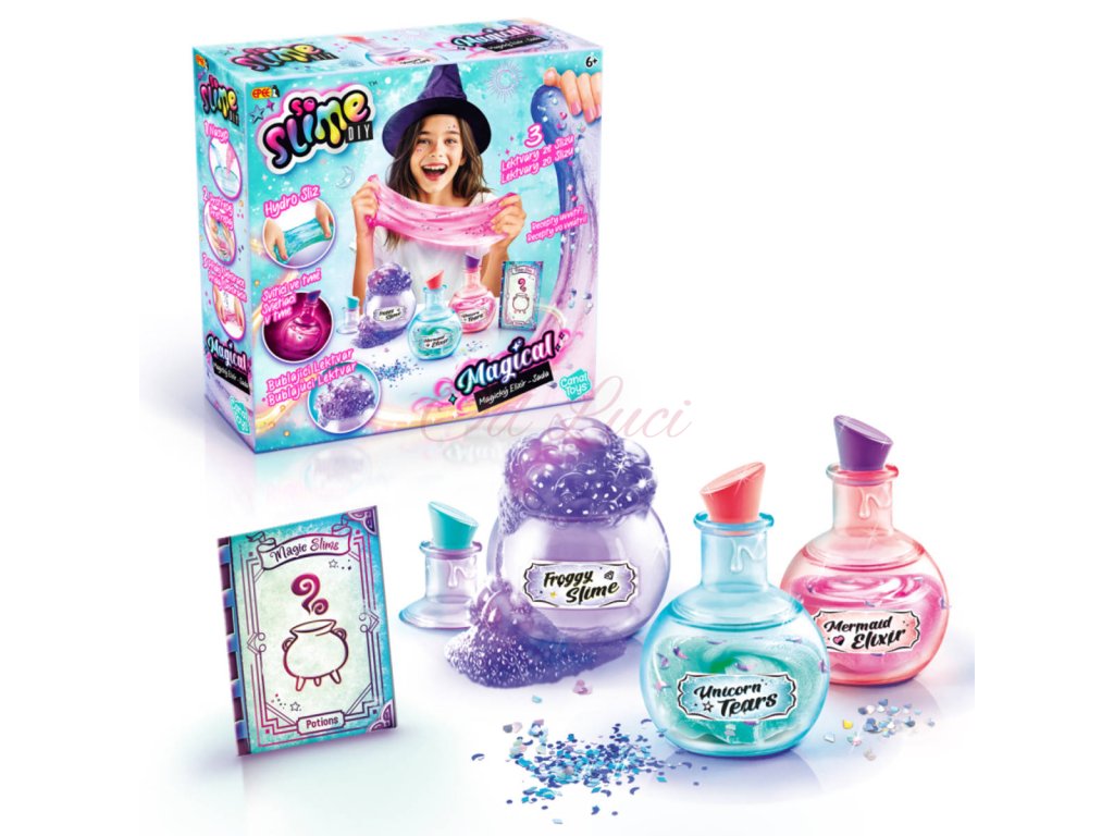 Novinka Magický elixír – sada zabaví každé tvořivé ručičky. Vytvořte si jedinečné magické elixíry do lahviček. V balení naleznete návod i recepty na jednotlivé lektvary ze slizu. Zamíchejte prášky, vodu, třpytky – jako skutečný kouzelník nebo alchymista! Sliz natahujte, mačkejte, hrajte si a užijte si zábavu.