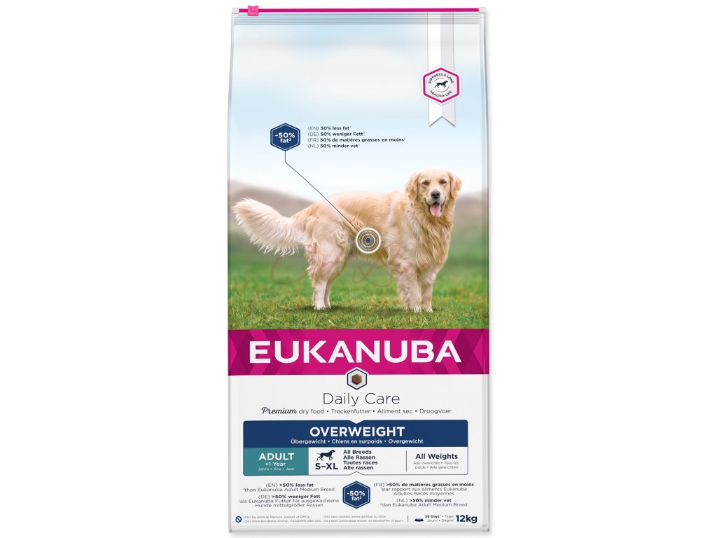Správná hmotnost je klíčový faktor pro zdraví a pohodu psa. Přesto počet psů s nadváhou roste. Nadváha zvyšuje riziko chorob, jako je cukrovka, onemocnění srdce a problémy s klouby. Výživa hraje při kontrole hmotnosti klíčovou roli. Proto společnost Eukanuba vyvinula krmivo Eukanuba Excess Weight, které dospělým psům pomáhá dosáhnout štíhlého těla a užít si aktivní interakce s jejich páníčky.