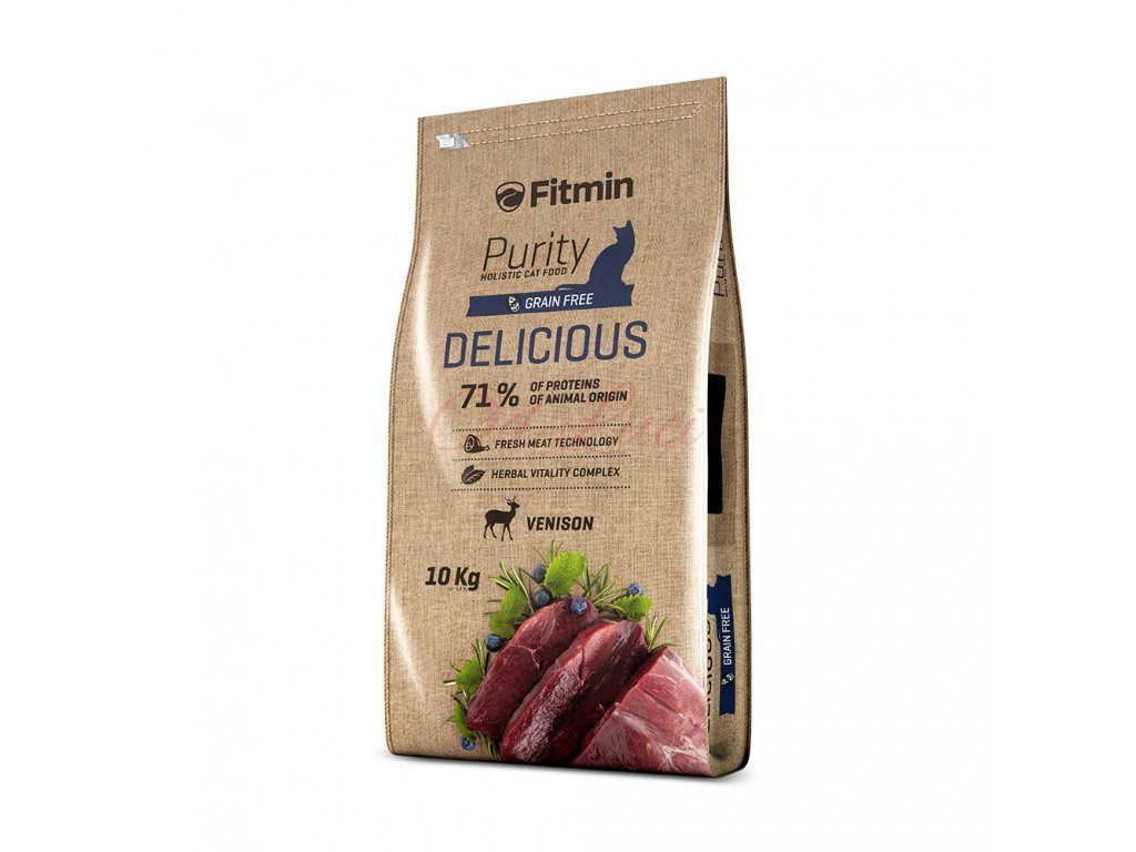 Kulinářský zážitek pro Vaši kočku. To je krmivo Fitmin cat Purity Delicious. Jedná se o holistické krmivo pro kočky, ve kterém najdete bohaté zastoupení čerstvé zvěřiny, bylinky na podporu vitality organismu, ovoce i zeleninu. Nejenže uspokojíte i ty nejmlsnější jazýčky Vašich koček, ale zároveň jim poskytnete prvotřídní kvalitu. Krmivo pro kočky Fitmin cat Purity Delicious je tzv. Grainfree krmivo, to znamená, že neobsahuje obiloviny, je bezlepkové a snižuje potencionální riziko výskytu alergických reakcí (např. na pšeničný lepek a kukuřičný gluten). Krmivo je svým unikátním složením ideální pro mlsné kočky, kterým jen tak něco k chuti nepřijde. Díky němu bude Vaše kočka nejen spokojená ale i ve vynikající kondici. Granule pro kočky Fitmin cat Purity Delicious obsahují bylinnou směs, která má mnoho blahodárných účinků. Granule pro kočky Fitmin cat Purity Delicious jsou vyráběny nejmodernějšími technologiemi, jsou vyvážené, obsahují vysoký podíl živočišných složek a mnoho dalších benefitů - zejména komplex dentální péče, prebiotika, cheláty a další.