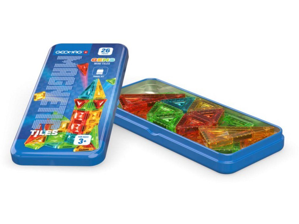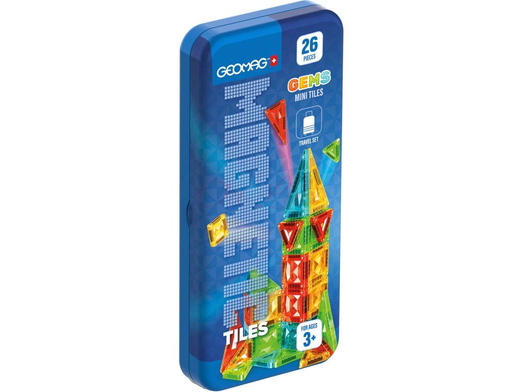 GEOMAG Magnetic Tiles Gems: Mini - kvalitní magnetická 2D/3D stavebnice. 26 průhledných barevných dílků s diamantovým vzhledem, s magnety na všech stranách, v plechové krabičce, cestovní verze.