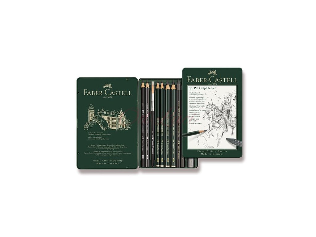 Grafitová tužka Castell 9000 a Pitt Monochrome s doplňkovým příslušenstvím v odolné plechové krabičce. Sada obsahuje 11 kusů.