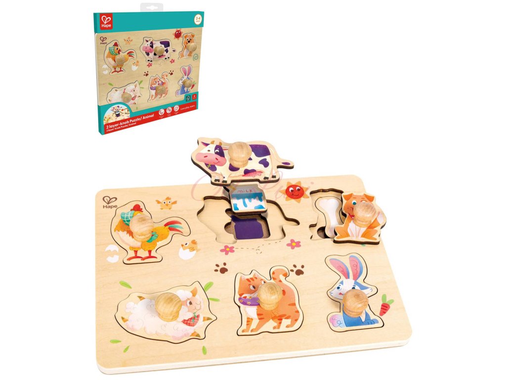 Hape dřevěné baby vládací puzzle na desce na téma Zvířátka - farma, 12 dílků s úchyty, dvouvrstvé, pro nejmenší děti.