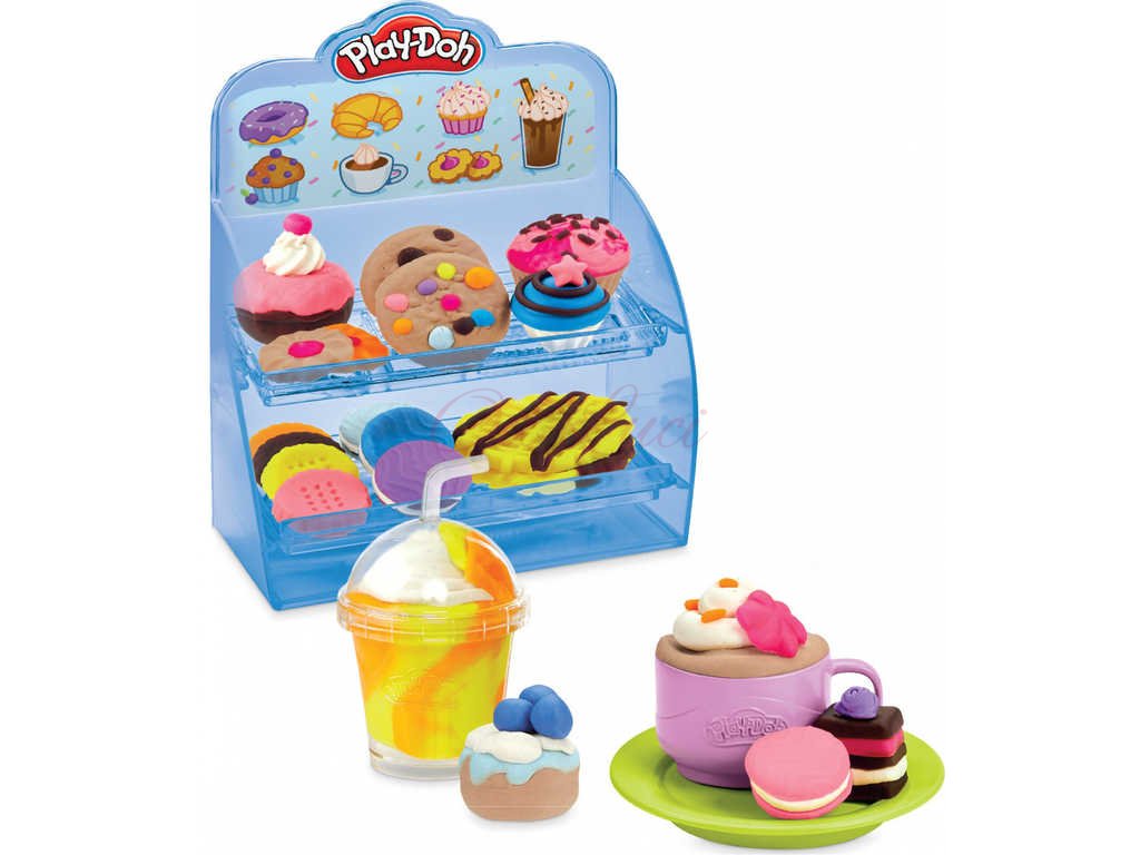 Hra na cukráře: malí budoucí baristé mohou z hmoty Play-Doh vyrábět sušenky, koblihy, koláčky a další. Vyskládejte je na stojan, který má také odnímatelné formy na výrobu ještě více falešného pečiva.