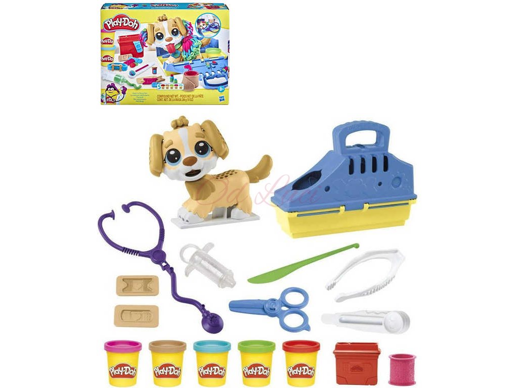 Obsah balení: štěně, přepravní box, kelímek s modelínou 5ks, stetoskop, injekční stříkačka, nůžky, nožík a další doplňky