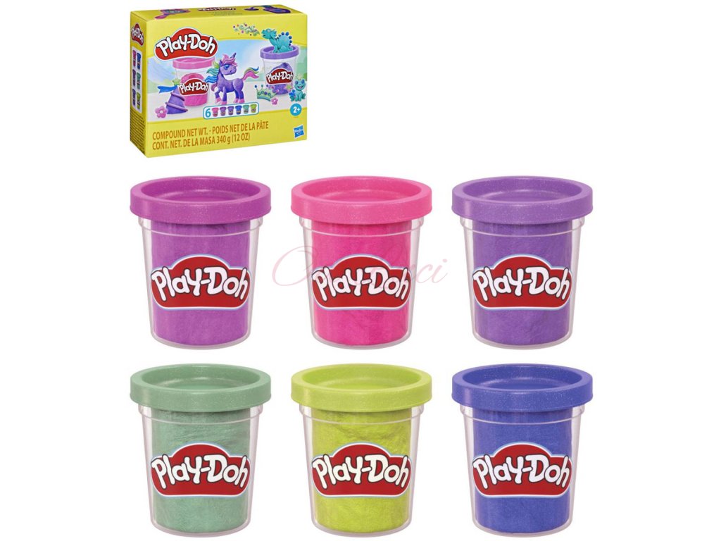 Barevná modelína Play-Doh třpytivá kolekce. Balení obsahuje 6 kelímků s modelínou různých barev.