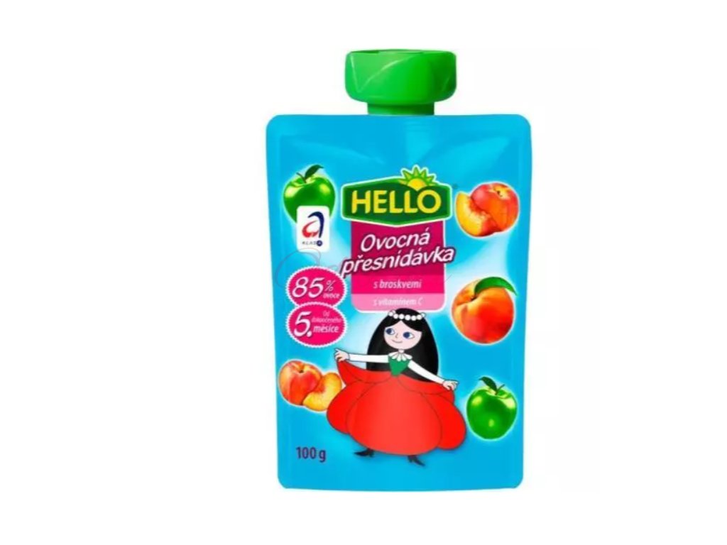 - Ovoce 85 % hm. (jablečná dřeň 60% hm., broskvová dřeň 25% hm.) voda, cukr, modifikovaný škrob, antioxidant : kyselina askorbová, vitamín C (min. 10 mg ve 100 g, tj. 40% referenční hodnoty vitaminu pro kojence a malé děti a 12,5% referenční hodnoty příjmu pro dospělé)