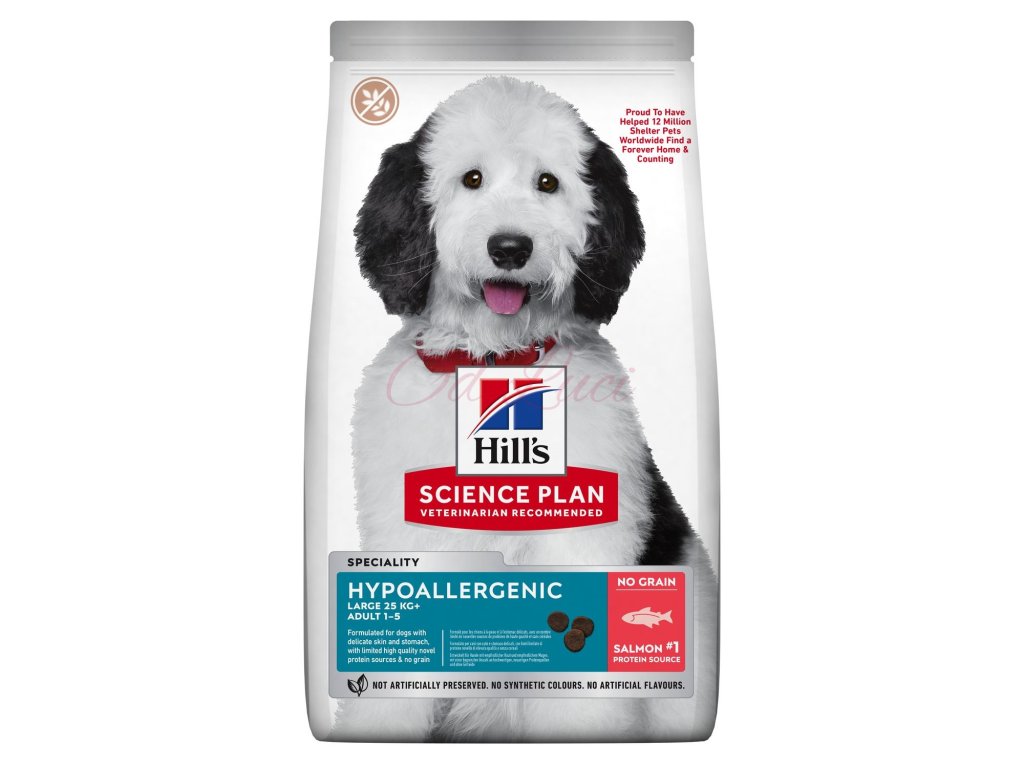 Hill's SCIENCE PLAN Hypoallergenic krmivo s lososem pro dospělé psy velkých plemen používá jemnou recepturu, která zahrnuje omezené zdroje nových vysoce kvalitních bílkovin, žádné obiloviny a je šitá na míru potřebám psů trpících přecitlivělostí na krmivo.