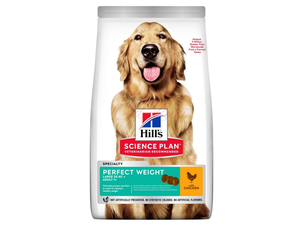 Hill's Science Plan Perfect Weight krmivo pro dospělé psy velkých plemen s kuřetem představuje lahodnou, klinicky ověřenou výživu pro dosažení a udržení zdravé váhy. Naše receptura s vysokým obsahem bílkovin a vlákniny je obohacena o L-karnitin a kokosový olej na podporu metabolismu zvířete.