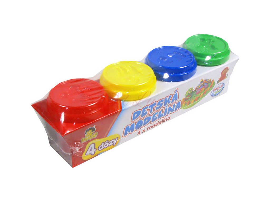 Balení obsahuje 4 ks modelíny (červená, žlutá, modrá, zelená)